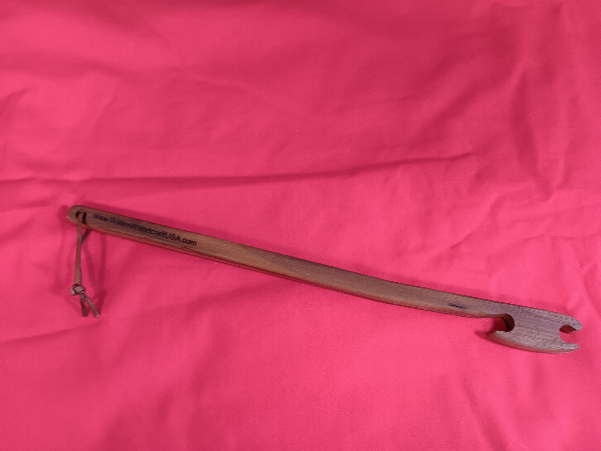 This Oven Push-Pull Stick is expertly handcrafted and designed to easily and safely maneuver oven racks. Made from durable wood, it provides a sturdy grip and reduces the risk of burns. Simplify your baking experience with this functional and stylish tool. Includes a leather strap for easy hanging.
