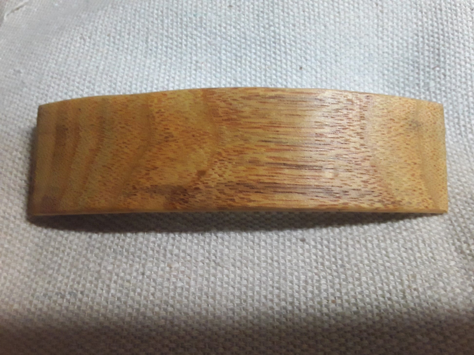 This hair barrette is expertly crafted from the vibrant canary wood of South America, revealing stunning hues of yellow orange with pink to dark red grain. The reliable French clip ensures secure and effortless hold, making it a stylish and functional addition to your hair accessory collection.
